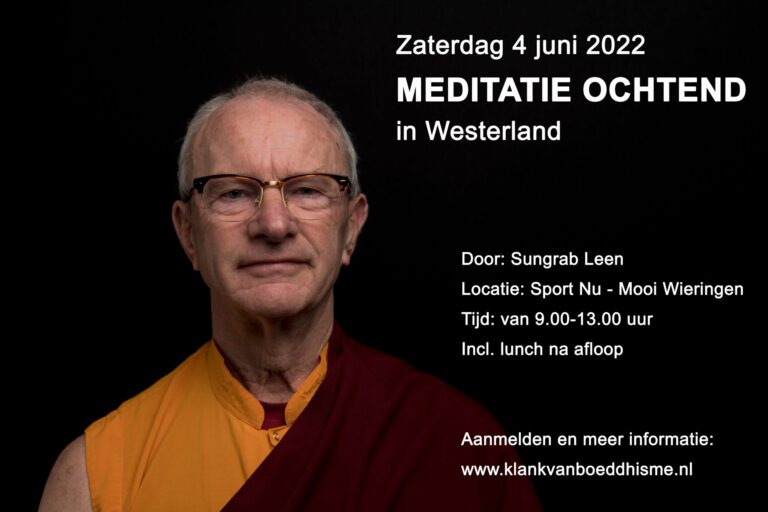 Van 20 tm 22 oktober 2023. Meditatiecentrum Karma Deleg Cho Pel Ling. Stoepawei 4,Hantum. Met lezingen en zes meditatiesessies van 1.5 uur. Thema’s: – Meditatiehouding in de buddhanatuur. – Concentratiemeditatie: kalm verblijven. – Helende en zuiveringsmeditatie. – Liefdevolle vriendelijkheid – Wijsheid Met kora’s (rondgangen) om de stupa’s en een rondleiding. Hulp bij maaltijden bereiden. 50…